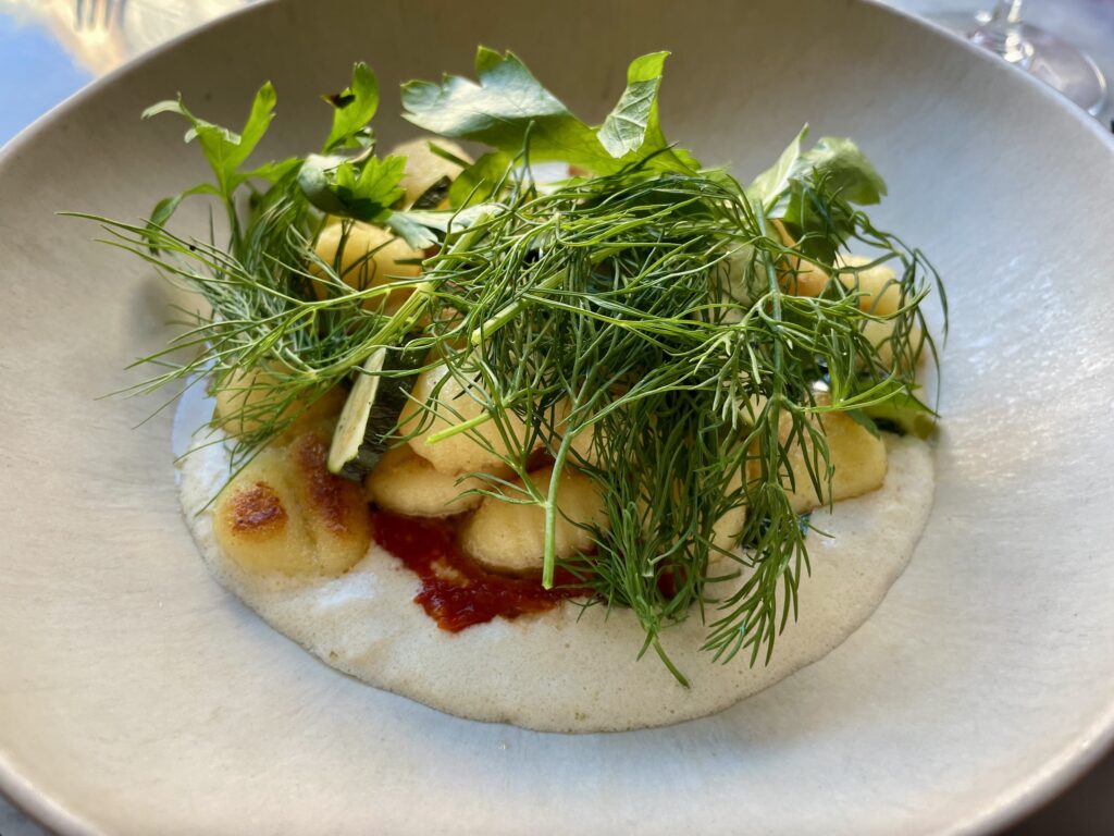 Pääruokani oli jännä kokonaisuus: gnoccheja arrabbiata- ja bechamel-kastikkeilla. Tulista tomaattia ja valkokastiketta, aika jännä. Ei tästä suursuosikkia tullut, mutta hauskasti perunapalleroiden ja kastikkeiden yhdistelmä toi mieleen lasagnen. Päällä oleva yrttikasa taas jäi irralliseksi elementiksi. Etenkin tillin maku olisi varmasti toiminut annoksessa, mutta isoina huituloina aromia ei juuri ehtinyt irrota.