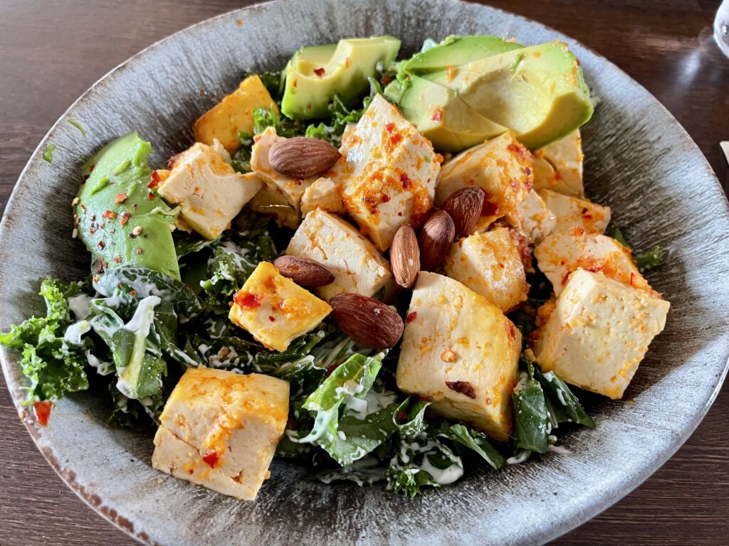 Koko päivän auki oleva ravintola–kahvila–baari tarjoaa (koko päivän) aamiaista, lounasta, kahvia, drinkkejä sekä hieman laajemman iltalistan. Menin paikalle lounasaikaan aikomuksenani testata avokadopasta, mutta tiskillä päädyinkin tilaamaan ”Epic Kalen” eli lehtikaali-tofusalaatin. Kuten moni muukin annos, se pitää tilata erikseen vegaanisena. Tässä annoksessa vegaaninen versio tarkoittaa parmesaanin pois jättämistä.
