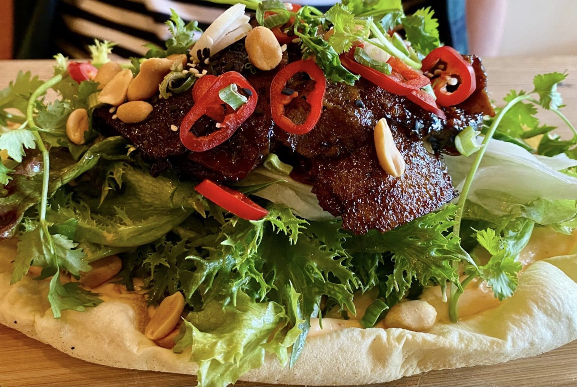 Pita-annokseni pohjana oli olettaakseni talon pizzapohja, jossa oli tosi kivaa sitkautta, voideltuna jonkinlaisella majoneesilla. Kimchin tilalle oli rakennettu oivallinen moniaineksinen, raikas ja monitahoisen aromikas salaatti. Se tuki mainiosti korealaisella barbecue-kastikkeella voideltua seitania. Ja että se seitan! Viime aikoina olen saanut oivallista ja omaleimaista seitania Tampereella Kattopuutarhassa ja Sastamalan Funkkistalossa, ja tämä liittyi seuraan elämän hienojen seitankokemusten joukkoon, mukaan lukien Philadelphian ”cheesesteak”.