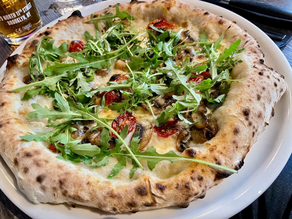 Verkkosivujen listalla näkyy olevan yksi vegaaninen vaihtoehto, mutta messujen aikaan käytössä oli eri lista. Kuten listan vakipizza, myös tämä oli bianca eli valkoinen pizza, ts. tomaattikastikkeen sijaan oli jonkinlaista vegaanista tuorejuustoa. Tämähän voi toimia mainiosti, jos täytteet istuvat yksiin sen kanssa, ja nyt näin kävi. Muina täytteinä oli paahdettuja sieniä, joissa oli kunnolla makua, sekä puolikuivattuja kirsikkatomaatteja, jotka nekin toimivat tosi kivasti. Lisänä oli tuttu kourallinen rucolaa.