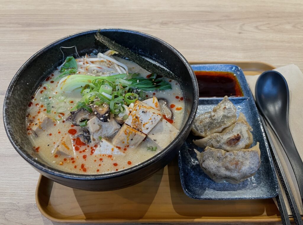 Lounaalla oli tarjolla kahta vegaanista vaihtoehtoa, kulhoannosta tai ramenia. Valitsin tietysti jälkimmäisen, ystäväni kehut muistaen. Tällä kertaa luvassa olisi tofu tantan ramen, jonka liemi perustuu soijamaitoon ja seesamitahnaan. Lounaaseen sai edullisesti mukaan lisukkeen, ja valitsin vaihtoehdoista gyozat. Kuten viimeksikin, ne olivat erinomaisia. Dipiksi valitsin soija-etikkasekoituksen.