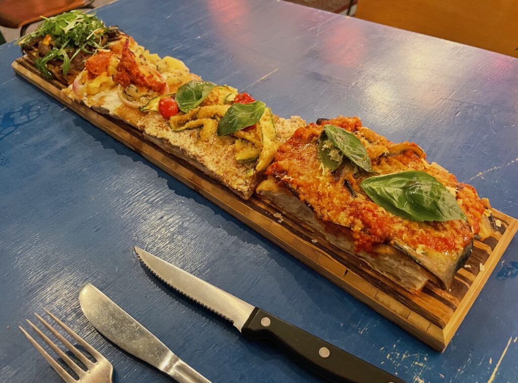 Alkupalaksi tilasimme neljä palaa roomalaistyylistä pizza al tagliota: perunaa ja jakkihedelmä-ndujaa, savusientä ja rucolaa, mantelia ja kesäkurpitsaa sekä tomaattia ja munakoisoa. Täytyy sanoa, että nämä olivat parhaat palapizzat, jotka olemme syöneet sitten edellisen Rooman Forno da Milvion vierailun jälkeen kolme vuotta sitten. Pohja oli rapeaa ja samalla ilmavaa, aivan täydellistä. Munakoiso oli selkeä suosikkimme, ja ainoastaan kesäkurpitsa kaipasi jotain suolaista ”yläpäätä” tuekseen. Muutoin yhdistelmät toimivat.