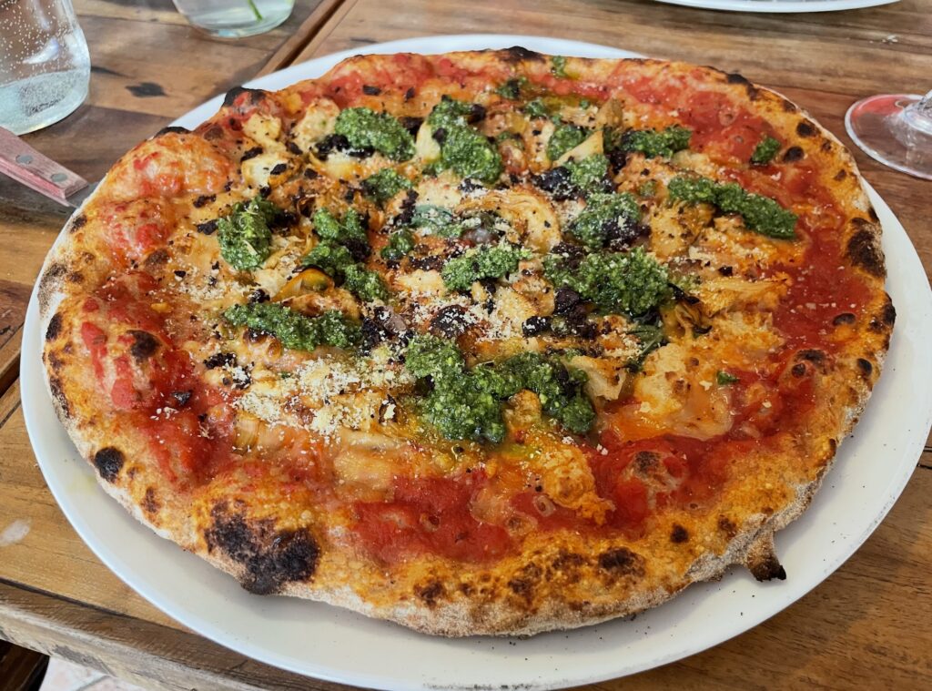 Tokoissa oli myös pistaasipestoa, vegaanista mozzarellaa, cashewraastetta, kuivattuja mustia oliiveja ja talon tomaattikastiketta. Olennaista paikan pizzoissa on taikina: se on hapanjuureen tehtyä, tummaa ja paahteisen makuista, sitkasta ja ilmavaa. Ihan tämän tyyliseen pizzaan en ole koskaan törmännytkään – aina on kiva, kun valikoima laajenee.
