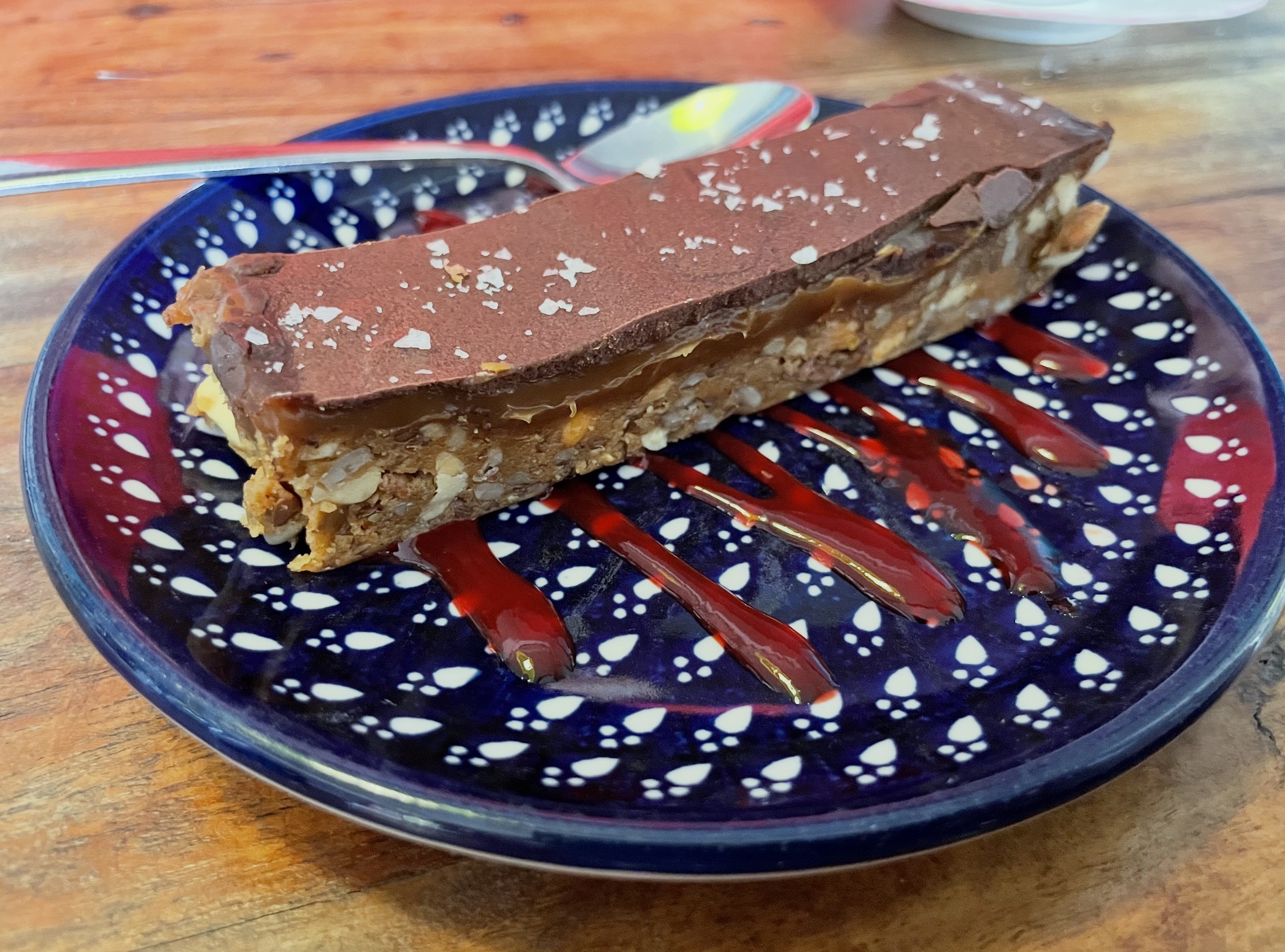 Jälkkäriksi jaoimme vaimon kanssa talon vegaanisen ”Snickersin”, joka sekin oli kerrassaan oivallinen.
