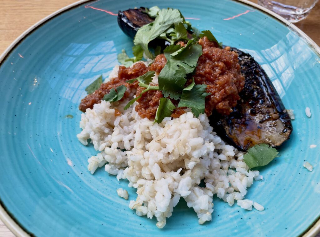 Ja ennen kaikkea: munakoiso oli kypsennetty aivan täydellisesti! Harvoin saa näin onnistunutta. Tykkäsin kastikkeesta, riisi oli täyteläistä, ja mikäli en ole väärässä, mukana oli toistakin, XO-tyylistä kastiketta. Tämän lounaan jälkeen saattoi jatkaa hyvällä mielellä ensin podcast-äänitykseen, sitten junamatkaan ja yhdistyksen vuosikokoukseen. Lämmittävä lounas kiireisen päivän keskellä.